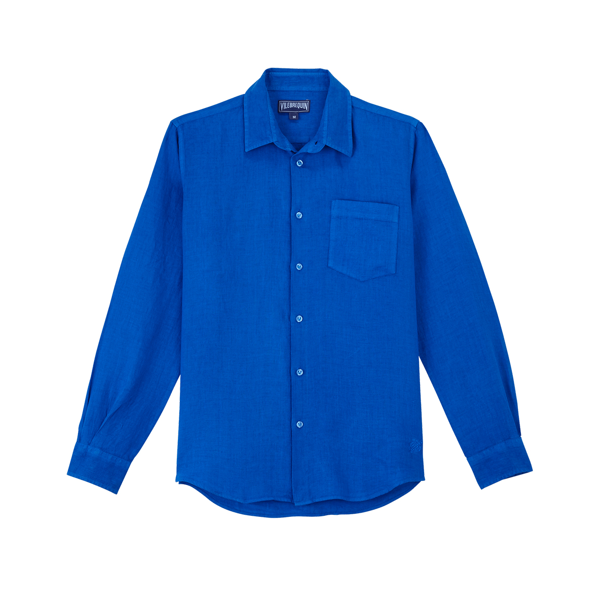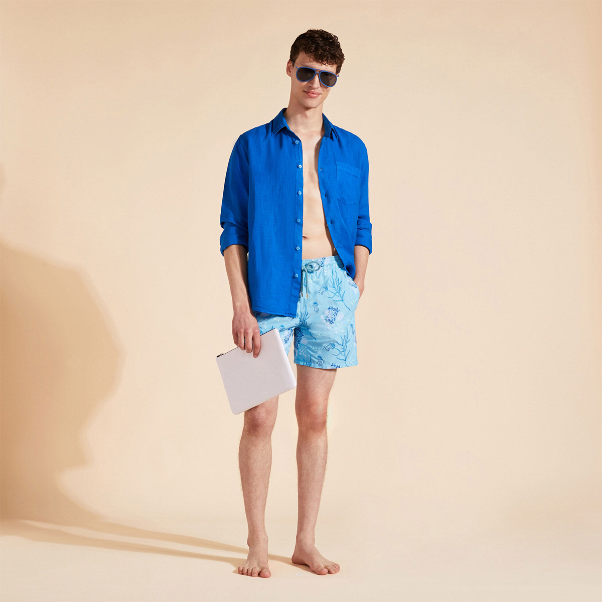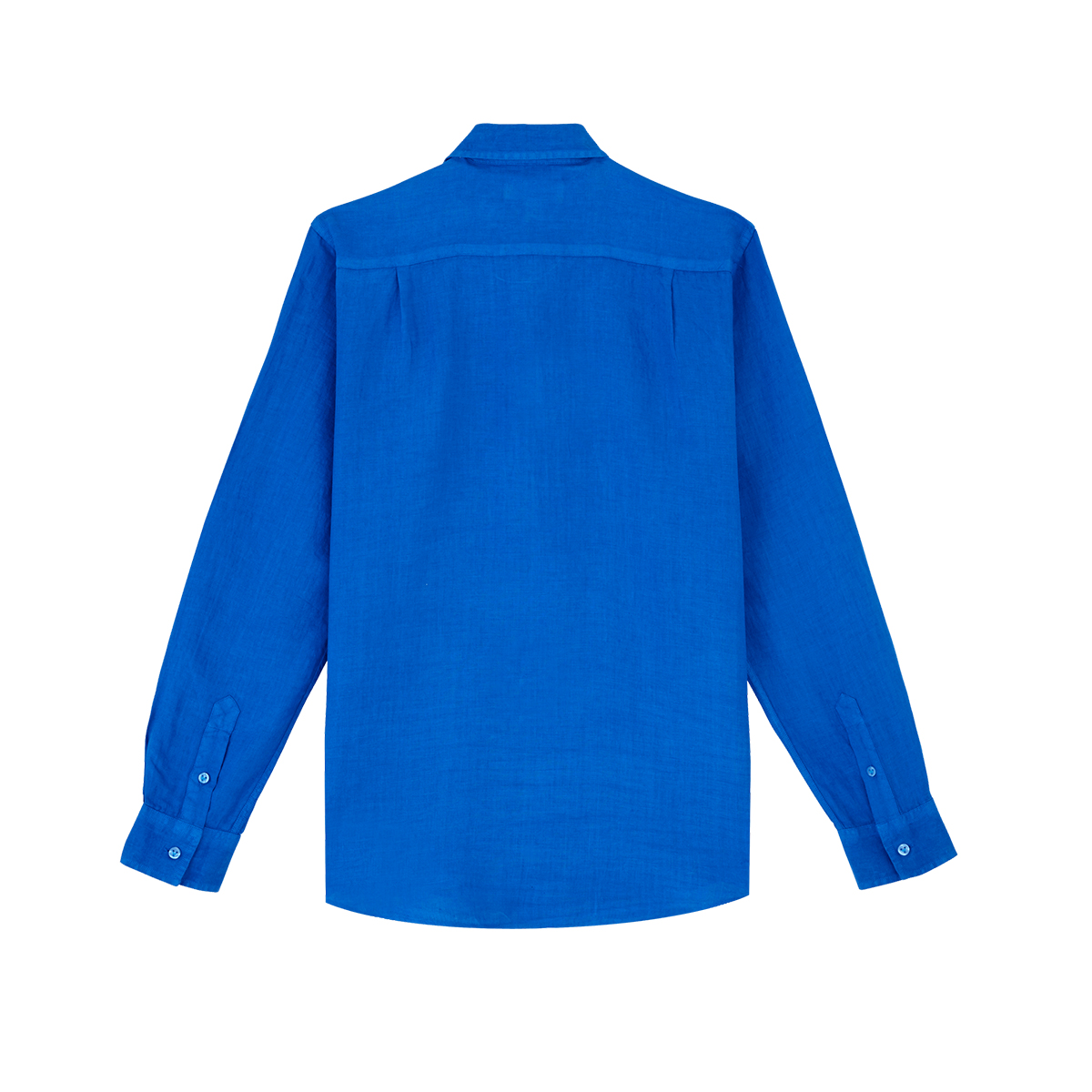 Caroubis uzun kollu keten gömlekler, Vilebrequin’in St Tropez’den ilham alan stilini klasik, sade bir kesimle gösteriyor. Yumuşak keten kumaştan yapılmış bu gömlek, eteğinde aynı tonda işlenmiş ikonik kaplumbağa logosu ile dikkat çekiyor.