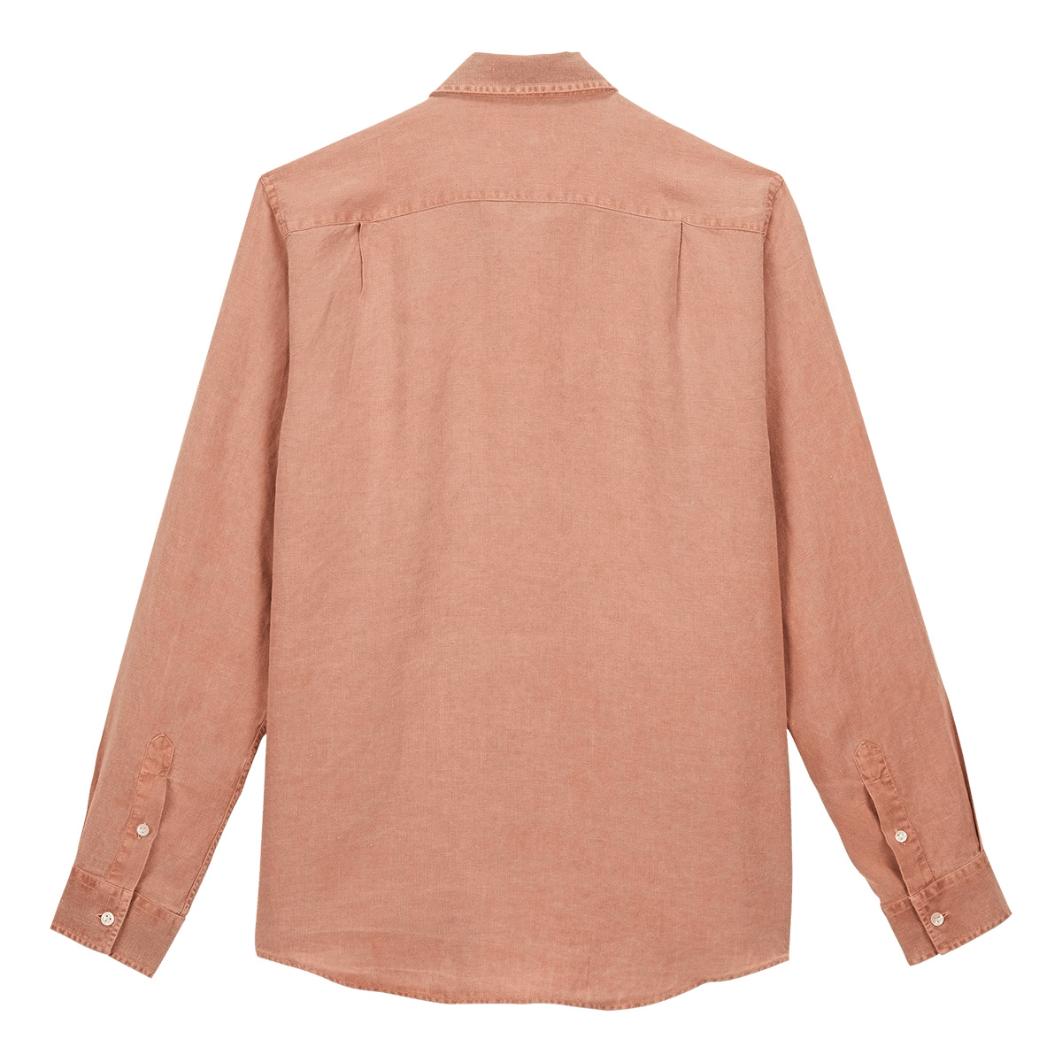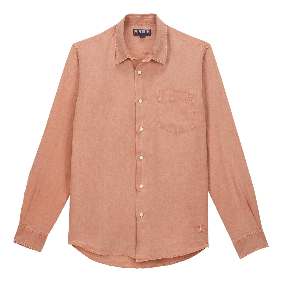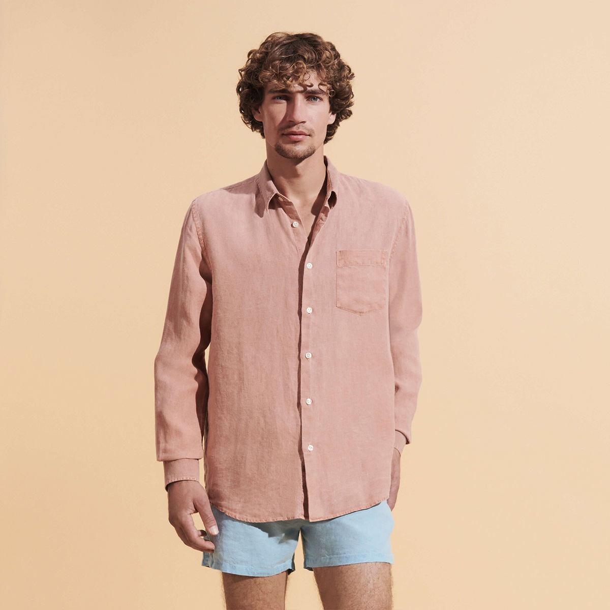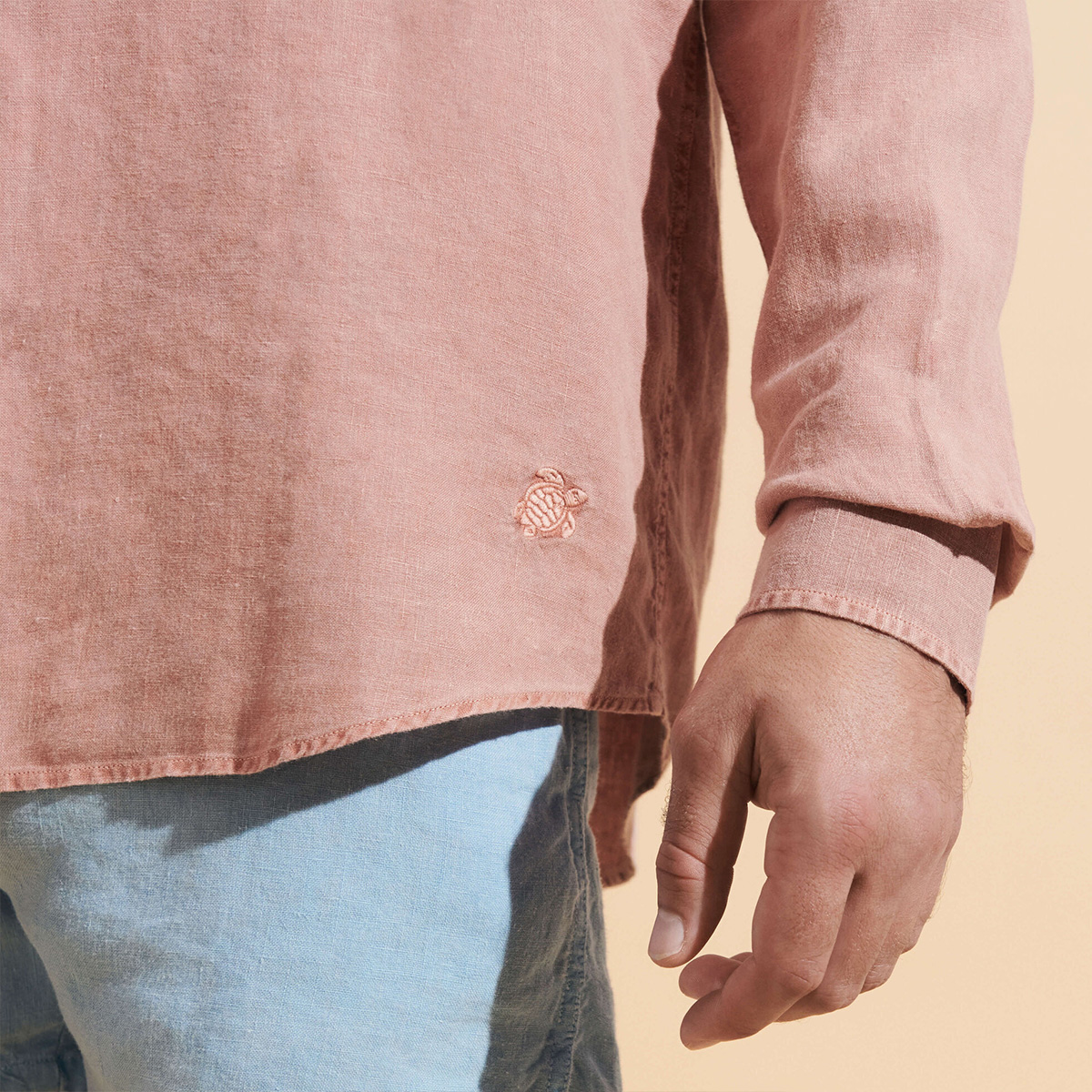 Caroubis uzun kollu keten gömlekler, Vilebrequin’in St Tropez’den ilham alan stilini klasik, sade bir kesimle gösteriyor. Yumuşak keten kumaştan yapılmış bu gömlek, eteğinde aynı tonda işlenmiş ikonik kaplumbağa logosu ile dikkat çekiyor.