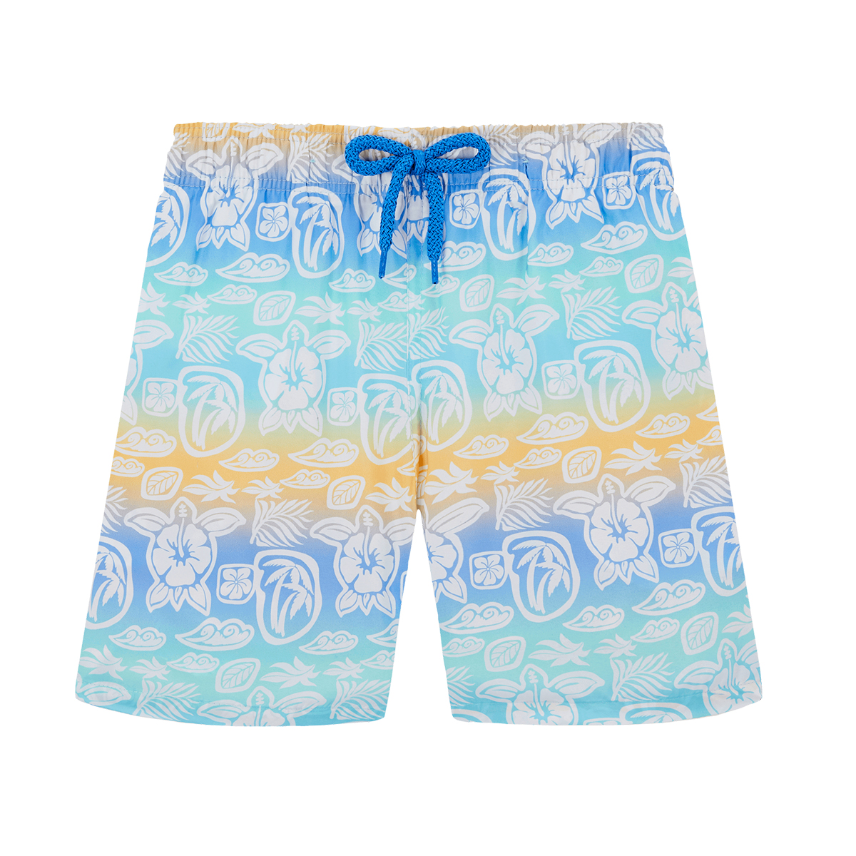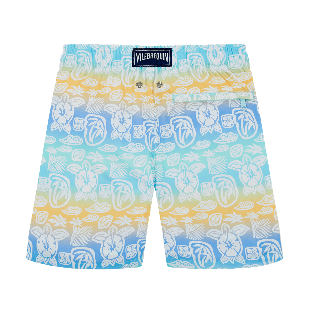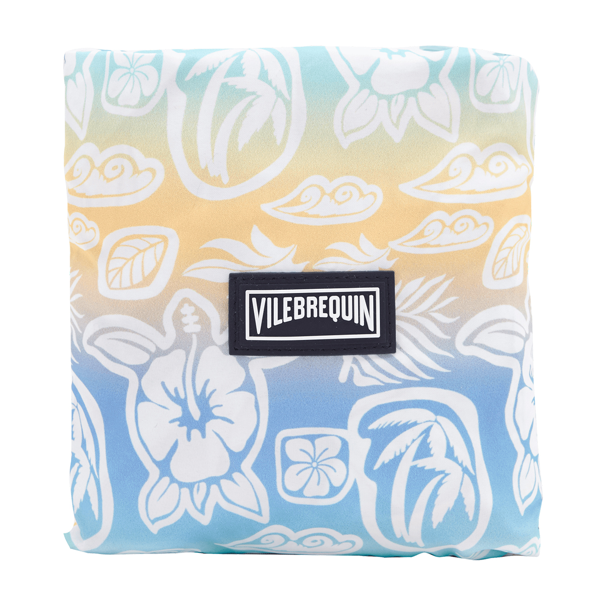 Bu çok hafif kumaşı ile dikkat çeken mayo, katlanarak arka cebine sığıyor ve üzerinde kauçuk Vilebrequin logosu yer alan bir keseye dönüşebiliyor.
